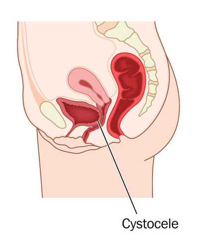 - Cystocele (bladder prolapse) occurs when the vaginal wall weakens and allows the bladder to herniate into the vagina. This condition can often cause stress incontinence.